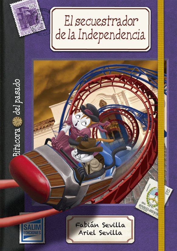 “... Si el secuestrador no reaparecía llegaríamos en pocas horas hasta lo más cerca de la ciudad que nos permitiera la autonomía de mi cinturón cohete. Extendí el cinto y lo ajusté a la cintura de Cayetano. Para que no tuviera miedo le pedí que imaginara que era un ángel. Con Ariadna nos metimos en su morral. Asomado pude comandar el despegue y después el vuelo; la brújula que extraje de mi mochila nos guió hacia el sudoeste. ‘Vuelo de gato no dura ni un rato ’, dice un famoso refrán felino que no se equivoca. Cuando llevábamos una hora y media de crucero, e incluso ya alcanzábamos a ver las torres de las iglesias porteñas, los cohetes perdieron autonomía. ¡Menos mal que me di cuenta! Pude maniobrar para que el aterrizaje de emergencia fuera exitoso. Caímos sobre un colchón de costales llenos con yerba mate misionera que una carreta tirada a bueyes llevaba hacia Buenos Aires ”. ¡Secuestraron a cuatro diputados del Congreso de Tucumán! Y la Independencia no fue declarada en 1816. Darwin, el gato Explorador del Pasado, deberá enfrentar a un poderoso enemigo “temporal” para que el 9 de Julio recupere su lugar en la historia. ¿Cómo sería nuestro presente si la historia argentina se alterara? Darwin y Marcopolo, dos gatos viajeros del tiempo, relatan y dibujan sus aventuras en el pasado, llenas de suspenso y humor. Las novelas de la serie BITÁCORA DEL PASADO mezclan fantasía y rigurosa información. ¡La historia nacional como jamás se contó!